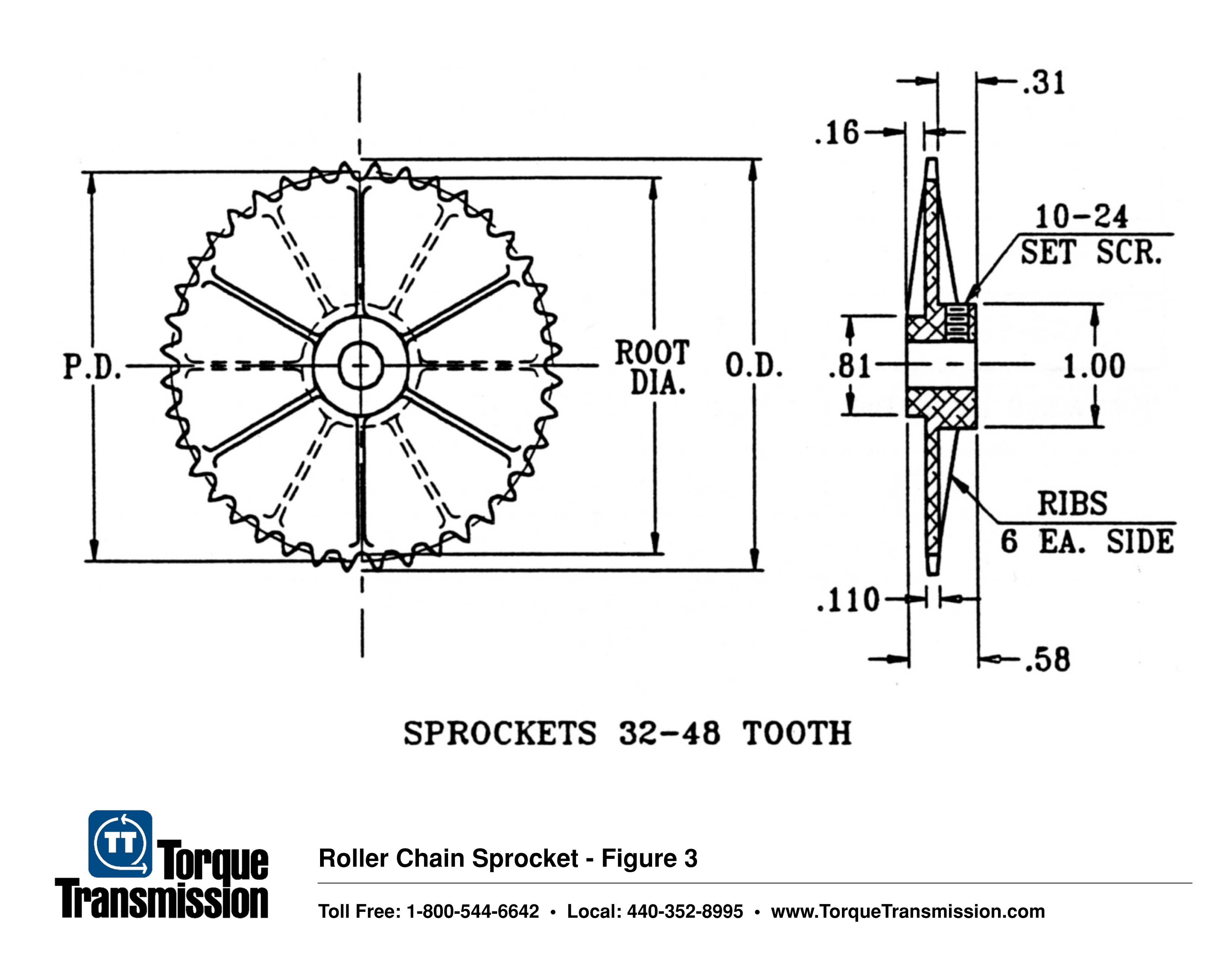 The sprockets are available in a wide selection of teeth from 9 to 48, all 1/4" pitch single sprockets. The hubs are drilled and tapped with #10-24 setscrew and they can be drilled with cross holes for dowel pins.